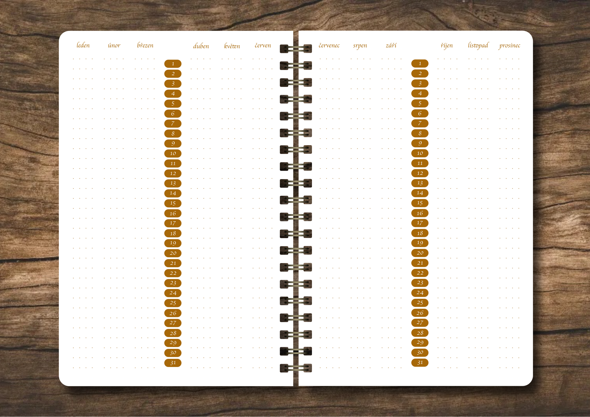 • Možnost přidání příloh: Přizpůsobte si diář podle svých potřeb! Náš diář je navržen tak, aby bylo možné přidávat další přílohy z naší nabídky, ať už pro sledování návyků, projektů nebo jiných aspektů plánování.