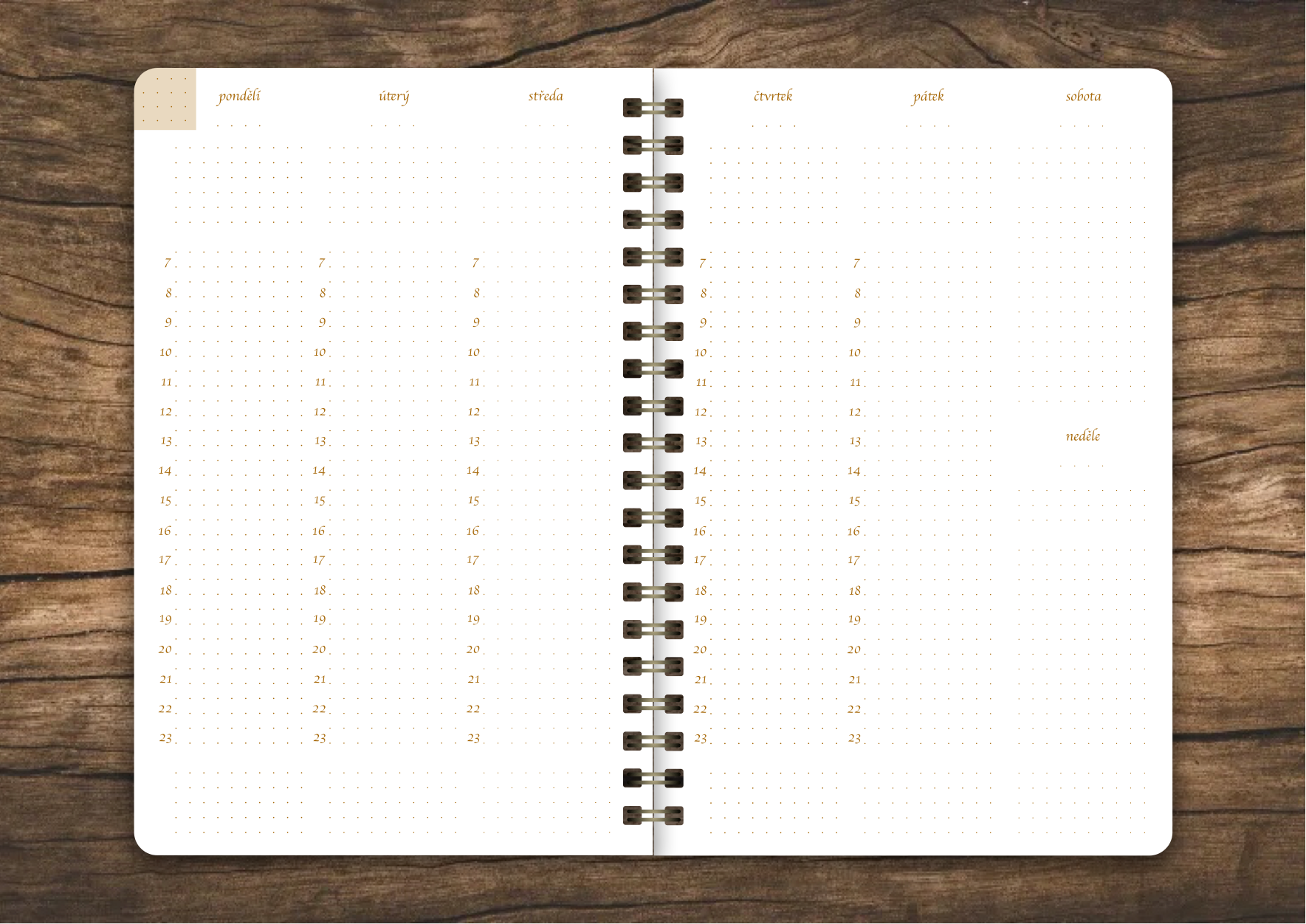 • Týdenní plánování: Přehledné týdenní rozvržení na dvojstraně vám poskytuje dostatek prostoru pro zapisování denních úkolů, schůzek a důležitých termínů. Udržujte si přehled o všem, co vás čeká, a plánujte s lehkostí. Možnost plánovat po půlhodinách ocení zejména to kdo mají denně tuny schůzek.